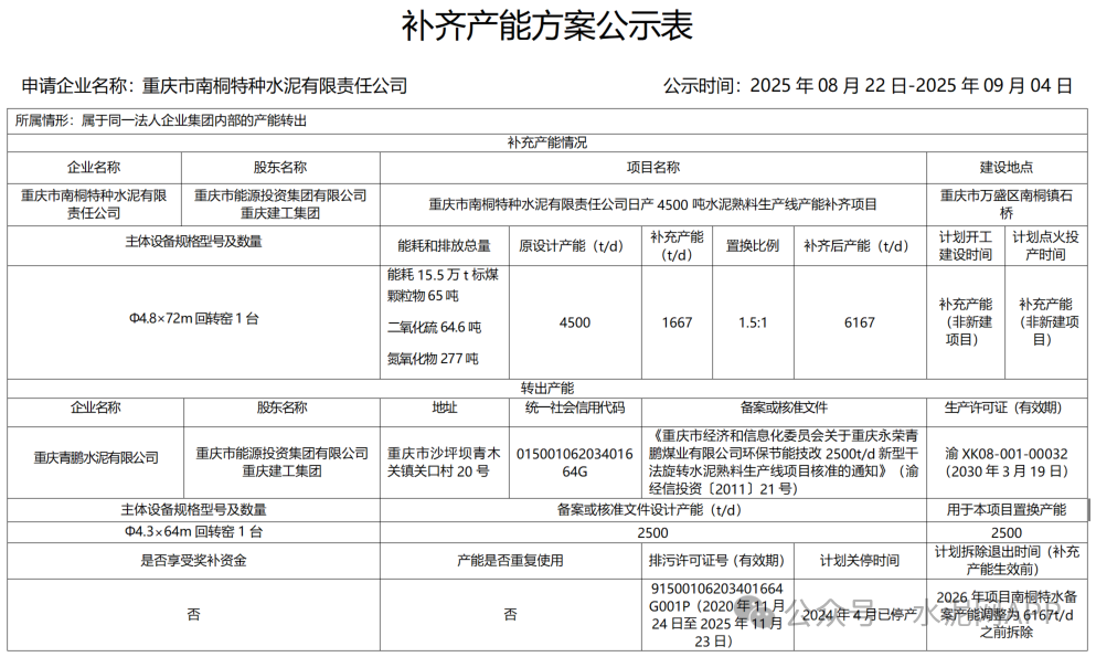 公示表中顯示,重慶市南桐特種水泥補充熟料產(chǎn)能1667t/d,退出產(chǎn)能2500t/d來自重慶青鵬水泥,置換比例1.5:1。