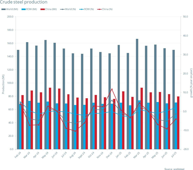 2025年7月全球70個(gè)納入世界鋼鐵協(xié)會(huì)統(tǒng)計(jì)國(guó)家/地區(qū)的粗鋼產(chǎn)量為1.501億噸,同比下降1.3%。