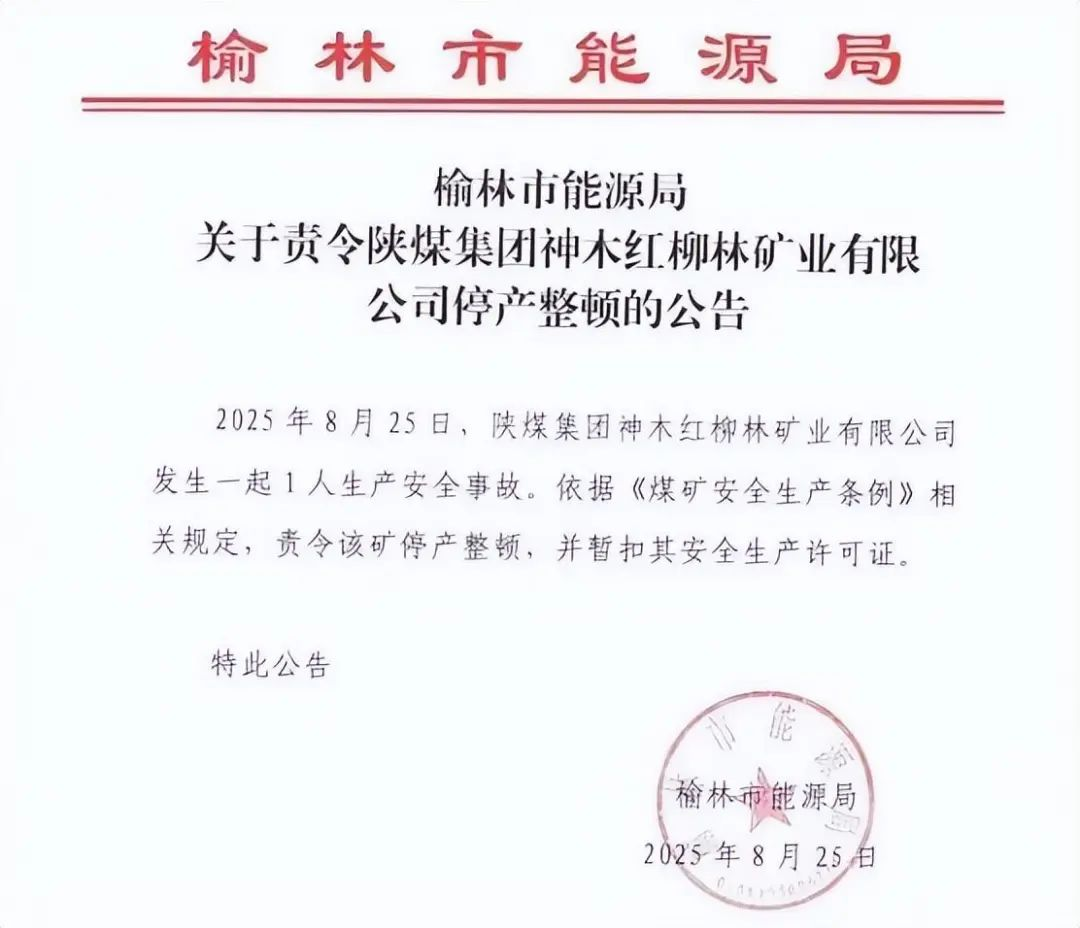 記者了解到,榆林市能源局已出具停產(chǎn)整頓公告。公告提到,8月25日,紅柳林煤礦發(fā)生一起1人生產(chǎn)安全事故。依據(jù)《煤礦安全生產(chǎn)條例》相關(guān)規(guī)定,責(zé)令該礦停產(chǎn)整頓,并暫扣其安全生產(chǎn)許可證。