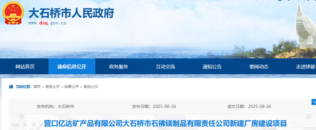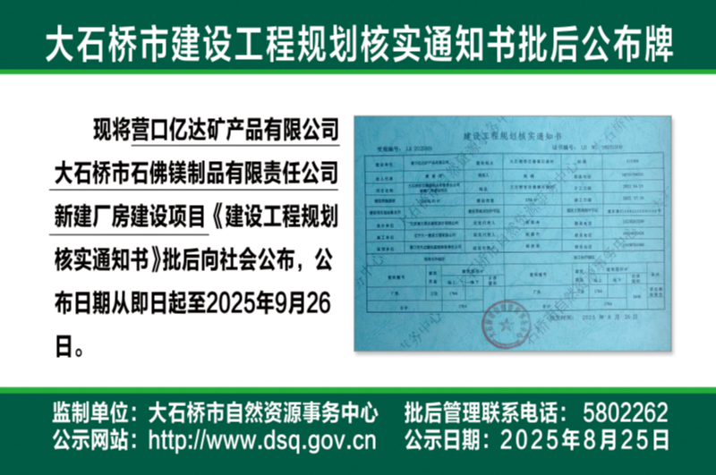 營(yíng)口億達(dá)礦產(chǎn)品有限公司大石橋市石佛鎂制品有限責(zé)任公司新建廠房建設(shè)項(xiàng)目