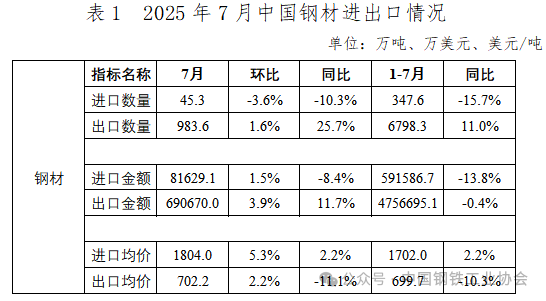 2025年7月,我國出口鋼材983.6萬噸,較上月小幅回升1.6%,出口規(guī)模保持相對穩(wěn)定,出口均價702.2美元/噸,較上月小幅上漲2.2%。1-7月,我國累計出口鋼材6798.3萬噸,同比增長11.0%,出口均價699.7美元/噸,同比下跌10.3%。7月,我國進口鋼材45.3萬噸,環(huán)比下降3.6%,降幅較上月進一步擴大,進口均價1804.0美元/噸,環(huán)比上漲5.3%。1-7月,我國累計進口鋼材347.6萬噸,同比下降15.7%,進口均價1702.0美元/噸,同比上漲2.2%。
