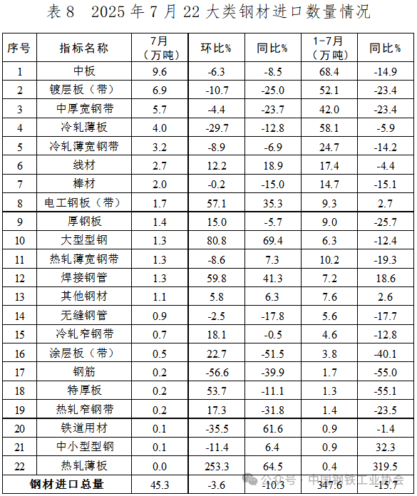 2025年7月,我國鋼材進口規(guī)模持續(xù)萎縮,為近10年以來單月進口量最低水平。各主要品種進口量環(huán)比大多下降,進口前5位的品種占當(dāng)月我國鋼材進口總量的比重較上月有所下降。7月,我國鋼材的主要進口來源及結(jié)構(gòu)仍保持穩(wěn)定,除自中國臺灣進口鋼材環(huán)比回升外,自其它主要國家進口鋼材數(shù)量環(huán)比均下降,且降幅大于總體水平。