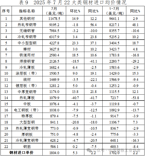7月,22大類鋼材品種中,有8類品種出口量環(huán)比下降,減量主要來自熱軋板卷產(chǎn)品。其中,熱軋薄寬鋼帶、大型型鋼、冷軋薄寬鋼帶和鐵道用材等4個品種出口量環(huán)比降幅超過10%,中厚寬鋼帶、焊接鋼管、無縫鋼管及熱軋薄板等品種出口量環(huán)比也出現(xiàn)一定程度下降。其余14類品種出口量環(huán)比出現(xiàn)增長,增量主要來自鍍層板(帶)、涂層板(帶)和棒材。1-7月,鍍層板(帶)是累計出口量最大的品種,占鋼材出口總量的17.9%;熱軋板卷產(chǎn)品累計出口量同比繼續(xù)呈下降態(tài)勢,但中厚寬鋼帶和熱軋薄寬鋼帶兩個主要品種累計出口量同比降幅小幅收窄;線材和棒材累計出口量同比持續(xù)擴大。7月,多數(shù)品種出口單價保持在較穩(wěn)定區(qū)間,電工鋼板(帶)出口單價環(huán)比跌幅最為明顯,為13.6%;厚鋼板出口單價環(huán)比漲幅最大,為11.0%。1-7月,電工鋼板(帶)和熱軋窄鋼帶2個品種出口單價同比已實現(xiàn)正增長,另有冷軋窄鋼帶等部分品種出口單價降幅同比收窄。