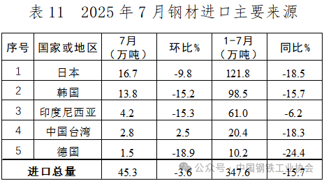 7月,我國鋼材進口結(jié)構(gòu)總體保持穩(wěn)定,鋼材進口規(guī)模雖持續(xù)減少,但環(huán)比降幅也在同步收窄。分國別來看,自日本、韓國、印度尼西亞和德國進口的鋼材環(huán)比持續(xù)減少。