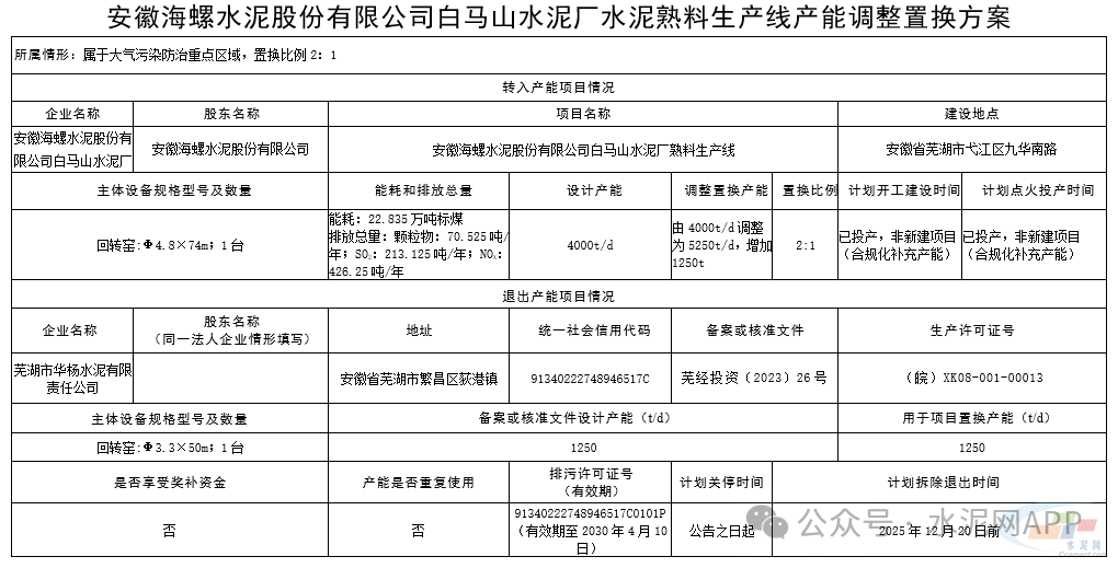 根據(jù)《水泥玻璃行業(yè)產(chǎn)能置換實(shí)施辦法(2024年本)》等文件要求,安徽海螺水泥股份有限公司白馬山水泥廠(chǎng)1條4000t/d水泥熟料生產(chǎn)線(xiàn)通過(guò)補(bǔ)產(chǎn)能方式將產(chǎn)能增加到5250t/d,置換產(chǎn)能來(lái)自蕪湖市華楊水泥有限責(zé)任公司、蕪湖瑞信水泥有限公司,置換比例為2:1。