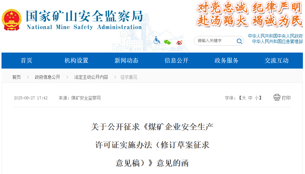 為進(jìn)一步加強(qiáng)煤礦安全生產(chǎn)許可證管理工作,國家礦山安全監(jiān)察局起草了《煤礦企業(yè)安全生產(chǎn)許可證實(shí)施辦法(修訂草案征求意見稿)》(附件1),現(xiàn)向社會(huì)公開征求意見,截止時(shí)間為2025年9月28日,請(qǐng)?zhí)顚憽墩髑笠庖姺答伇怼罚ǜ郊?),并發(fā)送至電子郵箱:mkaqxkz@163.com。