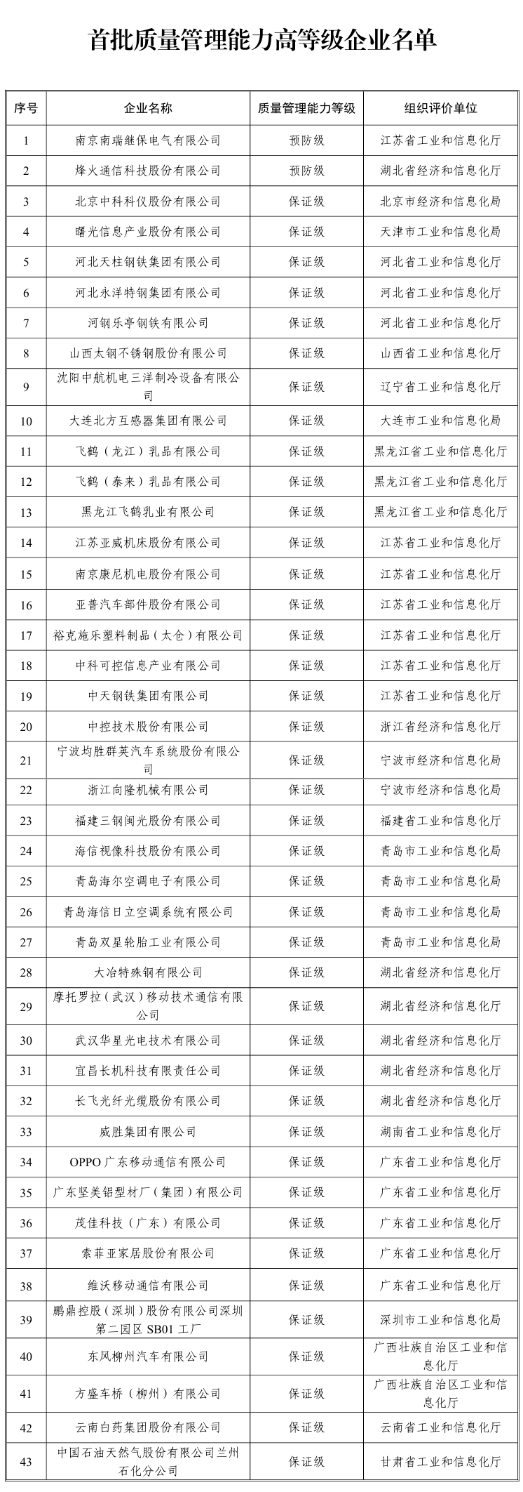 為落實《制造業(yè)卓越質(zhì)量工程實施意見》(工信部聯(lián)科〔2023〕249號)和《工業(yè)和信息化部辦公廳關于開展2024年制造業(yè)企業(yè)質(zhì)量管理能力評價工作的通知》(工信廳科函〔2024〕160號),經(jīng)自評價、評價復核、二次復核、征求意見、社會公示,我部確定了首批43家質(zhì)量管理能力高等級企業(yè)名單,現(xiàn)予以公布。