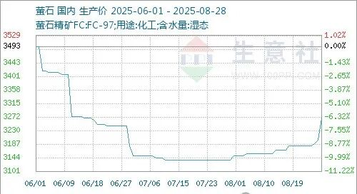 8月份國內(nèi)螢石價(jià)格走勢(shì)上漲,截止月末國內(nèi)螢石均價(jià)為3268.75元/噸,較月初價(jià)格3150元/噸上漲3.77%,同比下滑7.62%。