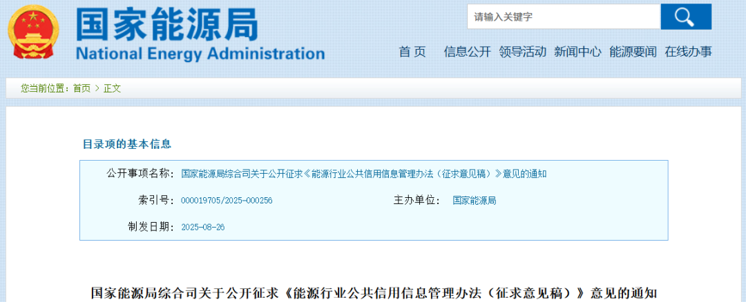 9月2日,國(guó)家能源局發(fā)布《能源行業(yè)公共信用信息管理辦法(征求意見(jiàn)稿)》。
