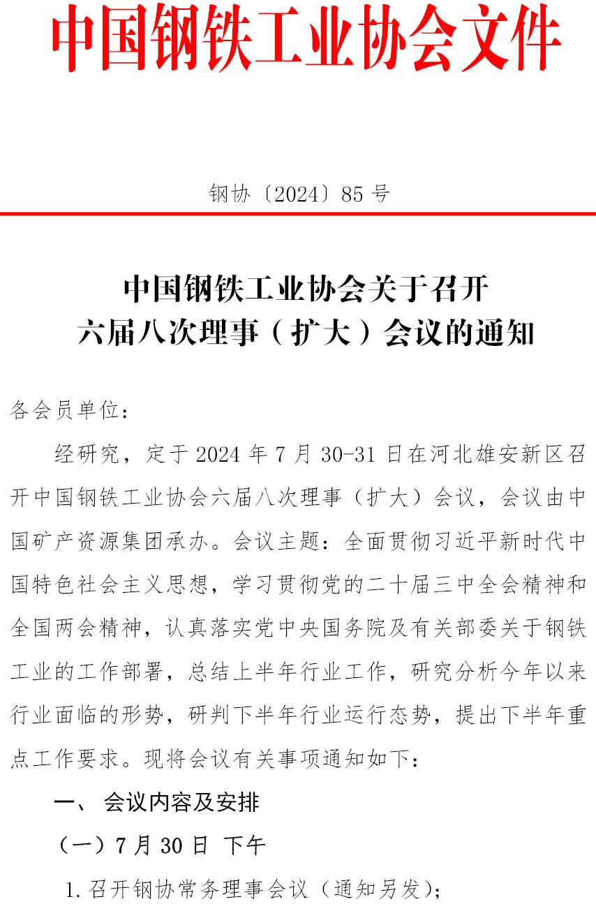 中國(guó)鋼鐵工業(yè)協(xié)會(huì)關(guān)于召開六屆八次理事(擴(kuò)大)會(huì)議的通知