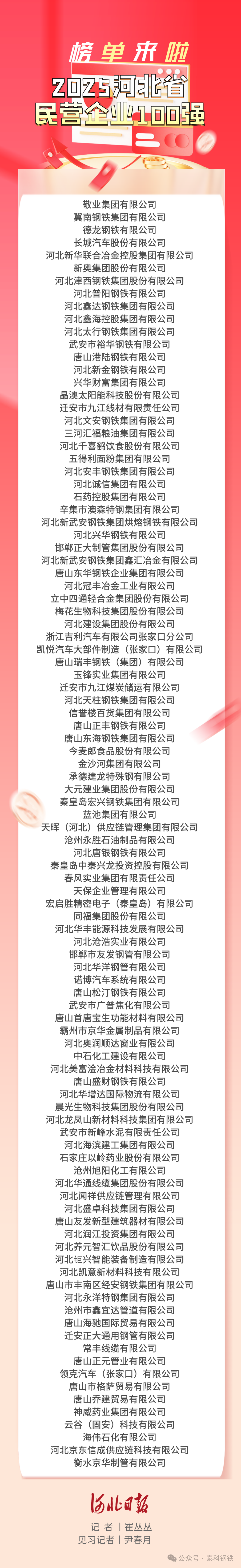 9月9日,河北省工商聯(lián)在滄州舉行2025年河北省民營企業(yè)100強(qiáng)發(fā)布會,發(fā)布2025河北省民營企業(yè)100強(qiáng)榜單。敬業(yè)集團(tuán)、冀南鋼鐵集團(tuán)、德龍鋼鐵包攬前三,新華聯(lián)合冶金、津西鋼鐵、普陽鋼鐵、鑫達(dá)鋼鐵進(jìn)前十!具體名單如下↓↓↓