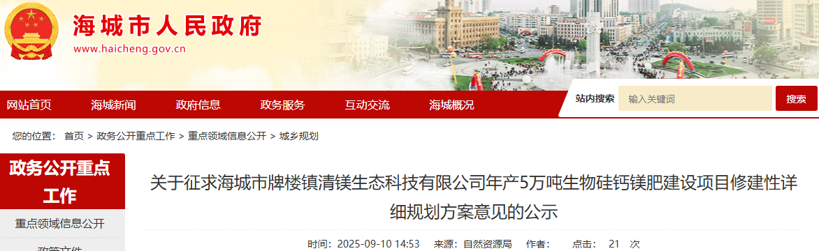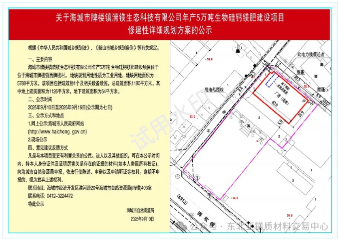 為切實增強規(guī)劃的科學(xué)性、合理性和可行性,征求公眾意見,根據(jù)《中華人民共和國城鄉(xiāng)規(guī)劃法》第二十六條規(guī)定,現(xiàn)將海城市牌樓鎮(zhèn)清鎂生態(tài)科技有限公司年產(chǎn)5萬噸生物硅鈣鎂肥建設(shè)項目修建性詳細(xì)規(guī)劃方案內(nèi)容公告如下: