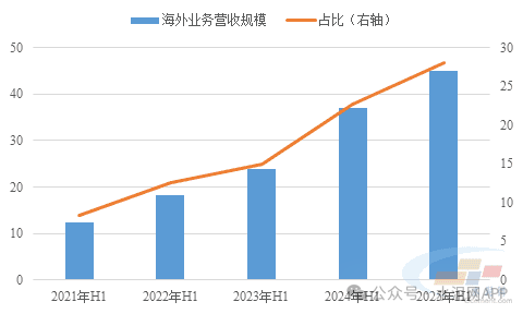 圖:2025年上半年華新水泥海外業(yè)務(wù)營收規(guī)模及占比(單位:億元、%)