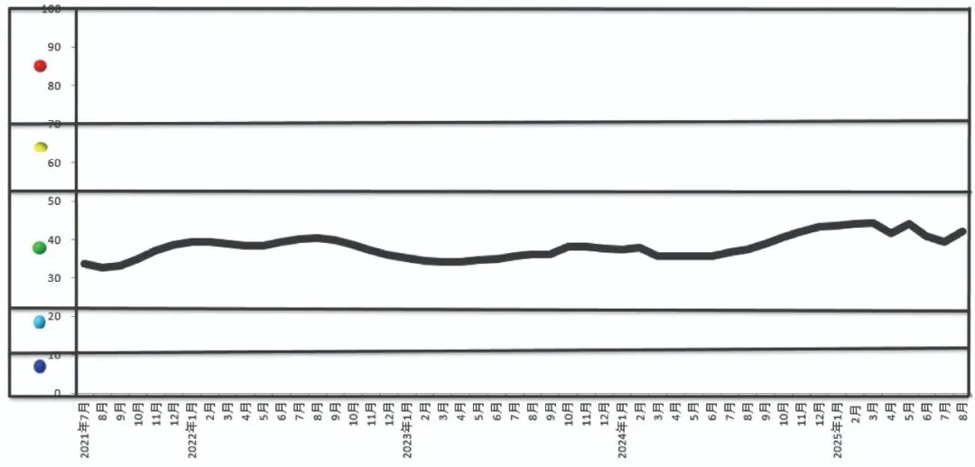 8月份,中國銅產(chǎn)業(yè)月度景氣指數(shù)為42.0,較上月上升2.7個百分點,繼續(xù)保持在 “正?!?區(qū)間運(yùn)行。中國銅產(chǎn)業(yè)月度景氣指數(shù)變化趨勢如圖1所示。