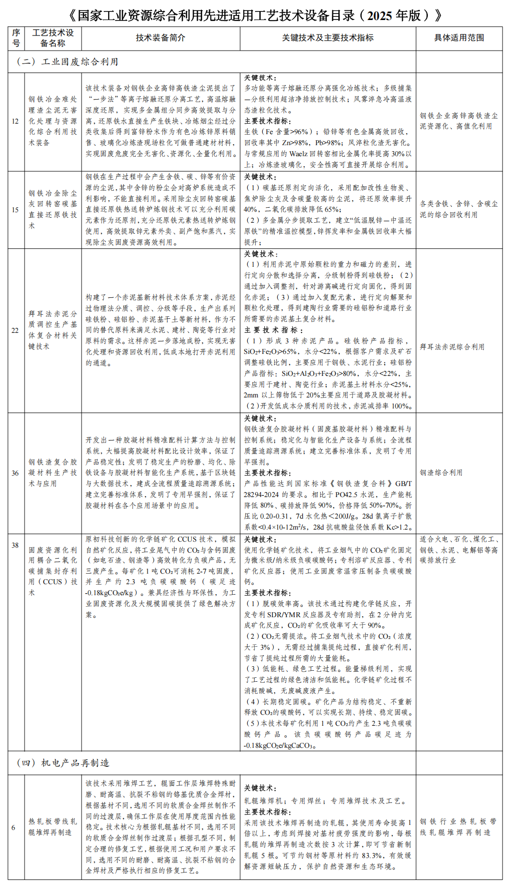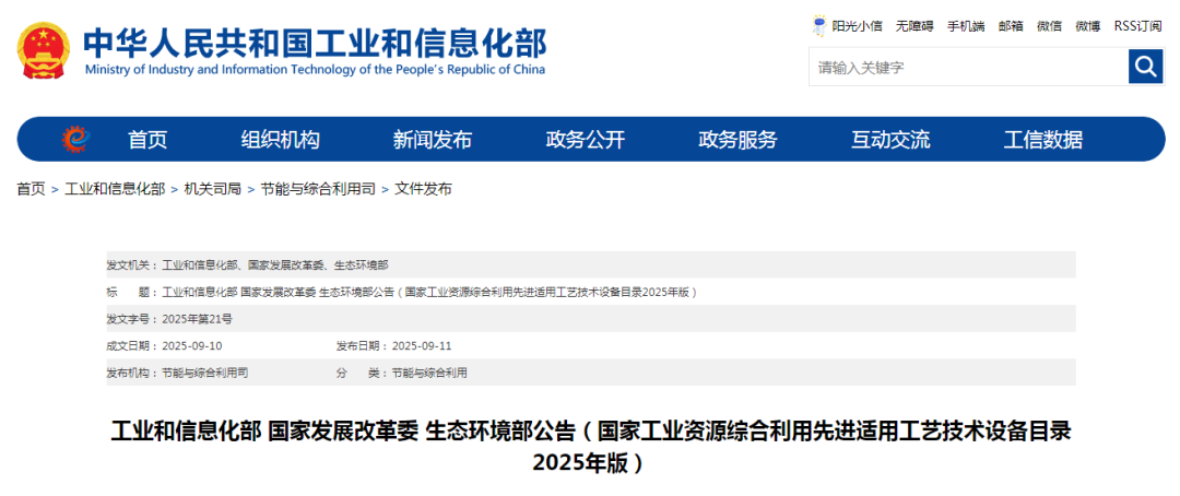 9月11日,為加快推動工業(yè)固廢源頭減量和規(guī)模化利用,提升再生資源綜合利用水平,發(fā)展高端智能再制造,工業(yè)和信息化部、國家發(fā)展改革委、生態(tài)環(huán)境部編制了《國家工業(yè)資源綜合利用先進適用工藝技術(shù)設(shè)備目錄(2025年版)》,于工信部官網(wǎng)進行了公示。