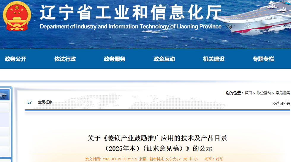 按照《遼寧省人民政府辦公廳關(guān)于推進(jìn)菱鎂行業(yè)高質(zhì)量發(fā)展的實(shí)施意見(jiàn)》(遼政辦發(fā)〔2023〕15號(hào))精神,為持續(xù)搭建技術(shù)交流平臺(tái),推動(dòng)新技術(shù)、新產(chǎn)品成果轉(zhuǎn)化,持續(xù)提升菱鎂行業(yè)高端化、智能化、綠色化水平。經(jīng)企事業(yè)單位自主申報(bào)、市工信局推薦,我廳征集了已進(jìn)入或接近產(chǎn)業(yè)化應(yīng)用階段、有推廣應(yīng)用意向、暫無(wú)社會(huì)異議的22項(xiàng)新技術(shù)、新產(chǎn)品,經(jīng)相關(guān)專家論證,現(xiàn)將《菱鎂產(chǎn)業(yè)鼓勵(lì)推廣應(yīng)用的技術(shù)及產(chǎn)品目錄(2025年本)(征求意見(jiàn)稿)》予以公示,公示期為5個(gè)工作日。