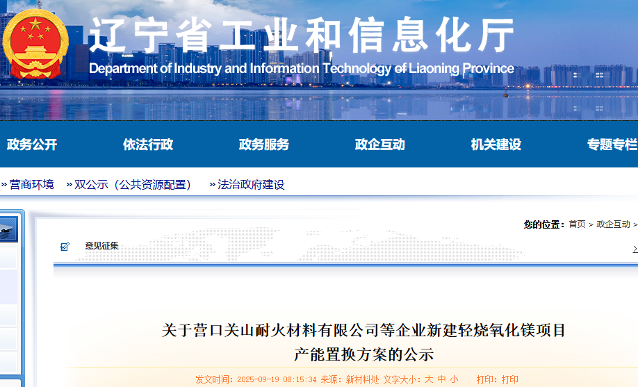 按照《遼寧省人民政府辦公廳關于推進菱鎂行業(yè)高質(zhì)量發(fā)展的實施意見》(遼政辦發(fā)〔2023〕15號)、《遼寧省菱鎂礦浮選及鎂砂行業(yè)產(chǎn)能置換辦法》(遼工信建材〔2024〕18號)要求,根據(jù)菱鎂行業(yè)專項整治工作進展,經(jīng)企業(yè)申請、市工信部門初審、我廳審核,現(xiàn)將營口關山耐火材料有限公司等企業(yè)新建輕燒氧化鎂項目產(chǎn)能置換方案予以公示,公示期10個工作日。