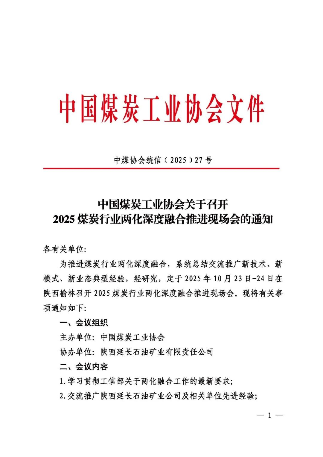 中國煤炭工業(yè)協(xié)會(huì)關(guān)于召開2025煤炭行業(yè)兩化深度融合推進(jìn)現(xiàn)場會(huì)的通知