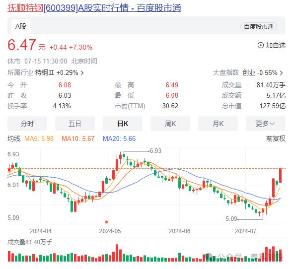 7月15日,撫順特鋼盤中漲幅達7.3%,截至11點30分,報6.47元。撫順特鋼近6個交易日股票已大漲27%。