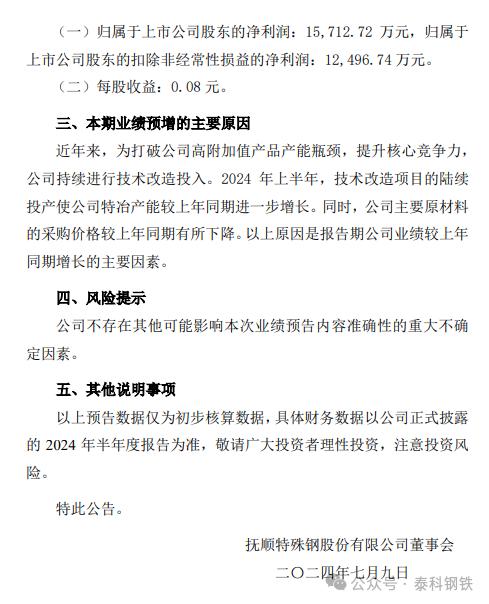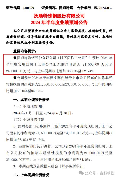 此前,撫順特鋼披露2024年半年度業(yè)績預增公告,該公司預計報告期歸屬于上市公司股東的凈利潤為2.15億元至2.4億元,與上年同期相比增加36.83%至52.74%。歸屬于上市公司股東的扣除非經(jīng)常性損益的凈利潤為2.1億元至2.3億元,與上年同期相比增加68.04%至84.05%。