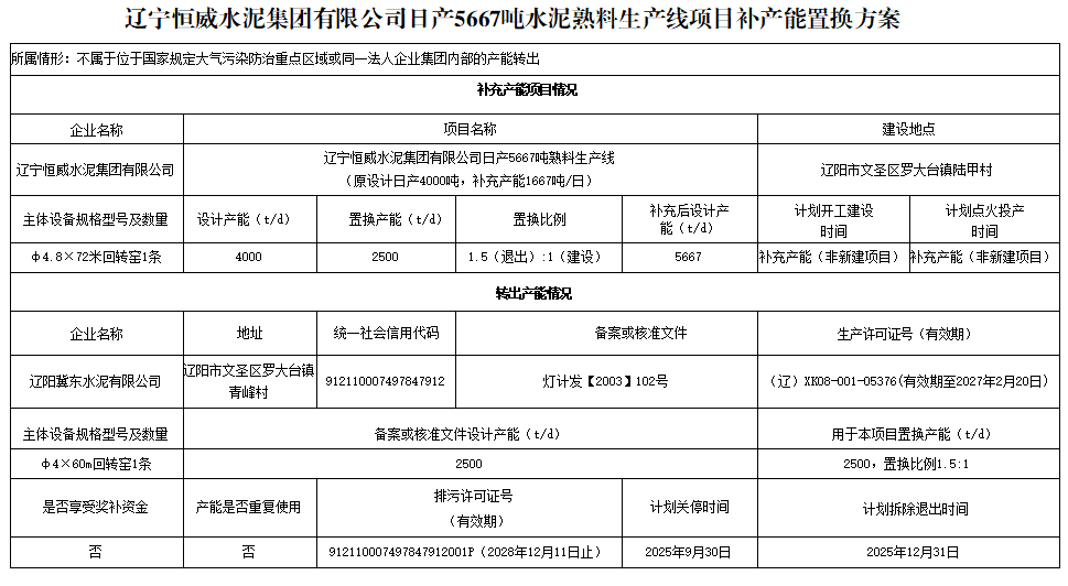 附件:遼寧恒威水泥集團(tuán)有限公司日產(chǎn)5667噸水泥熟料生產(chǎn)線項(xiàng)目補(bǔ)充產(chǎn)能置換方案