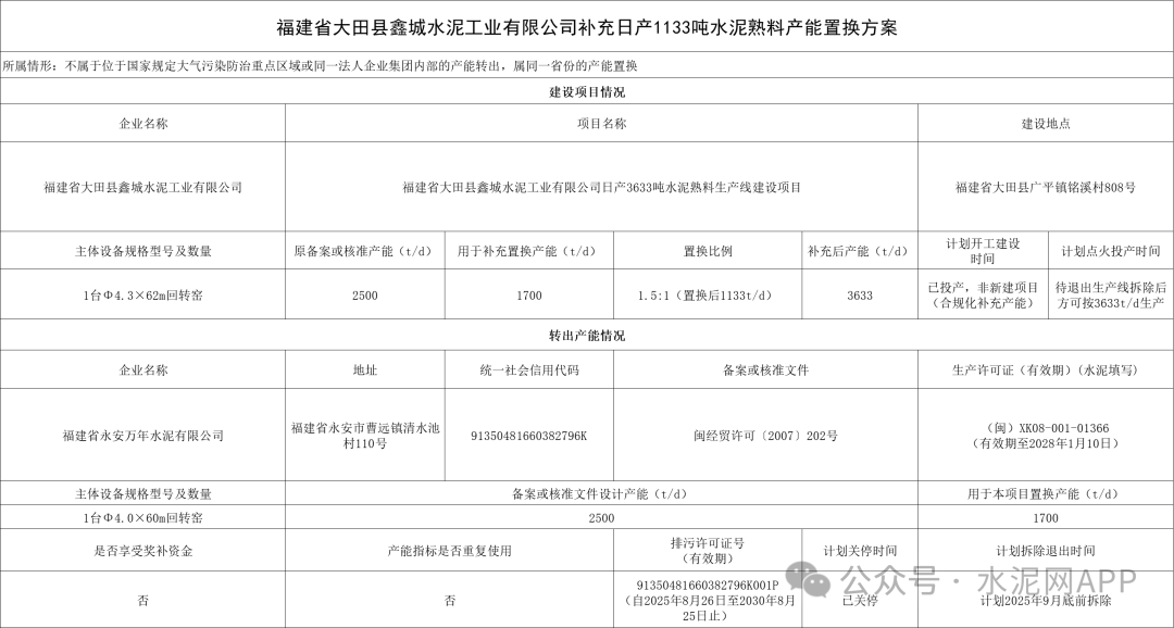 置換方案顯示,福建省大田縣鑫城水泥2500t/d補(bǔ)充產(chǎn)能1700t/d,補(bǔ)充后產(chǎn)能為3633t/d,退出產(chǎn)能來自福建省永安萬年水泥一條2500t/d熟料生產(chǎn)線(用于本項目1700t/d),置換比例1.5:1。