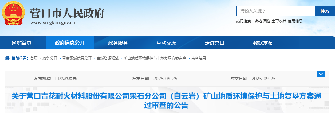 根據(jù)《國(guó)土資源部辦公廳關(guān)于做好礦山地質(zhì)環(huán)境保護(hù)與土地復(fù)墾方案編報(bào)有關(guān)工作的通知》(國(guó)土資規(guī)〔2016〕21號(hào))和《轉(zhuǎn)發(fā)國(guó)土資源部辦公廳關(guān)于做好礦山地質(zhì)環(huán)境保護(hù)與土地復(fù)墾方案編報(bào)有關(guān)工作的通知》(遼國(guó)土資辦發(fā)〔2017〕88號(hào))有關(guān)要求,營(yíng)口青花耐火材料股份有限公司采石分公司(白云巖)礦山地質(zhì)環(huán)境保護(hù)與土地復(fù)墾方案通過審查,現(xiàn)予公告。