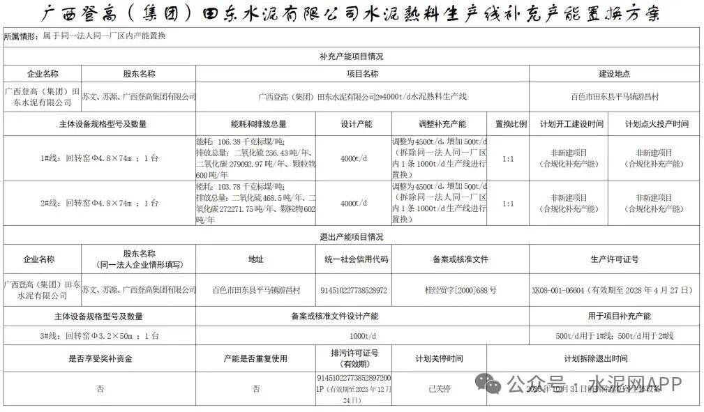 方案顯示,廣西登高(集團(tuán))田東水泥1#、2#4000t/d生產(chǎn)線各補(bǔ)充產(chǎn)能500t/d,退出產(chǎn)能來(lái)自同公司3#1000生產(chǎn)線,置換比例1:1。