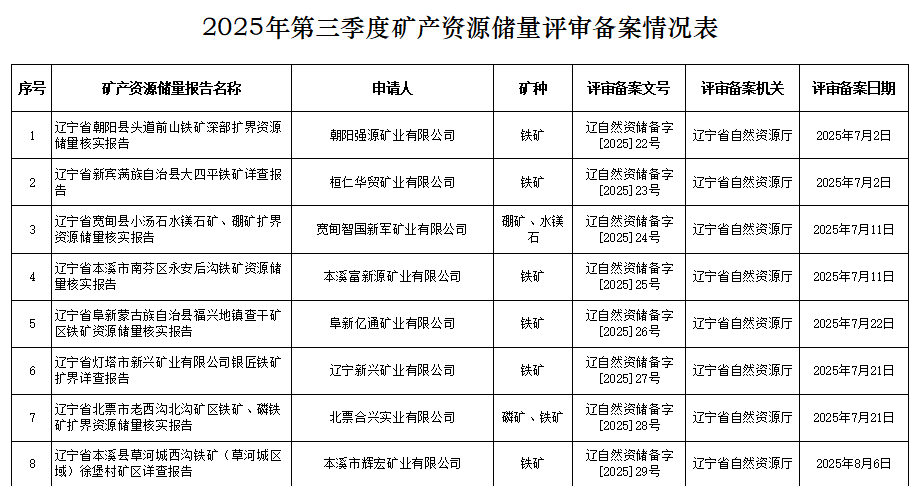 遼寧省2025年第三季度礦產(chǎn)資源儲(chǔ)量評(píng)審備案情況表