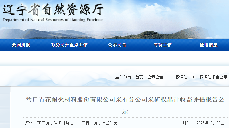 營口青花耐火材料股份有限公司采石分公司采礦權(quán)出讓收益評(píng)估報(bào)告通過遼寧省自然資源廳門戶網(wǎng)站向社會(huì)公示,公示10個(gè)工作日。如有異議,請(qǐng)于公示之日起10個(gè)工作日內(nèi)以電話方式先向省自然資源廳礦產(chǎn)資源保護(hù)監(jiān)督處提出簡要意見,隨后及時(shí)將書面意見反饋到省自然資源廳礦產(chǎn)資源保護(hù)監(jiān)督處。