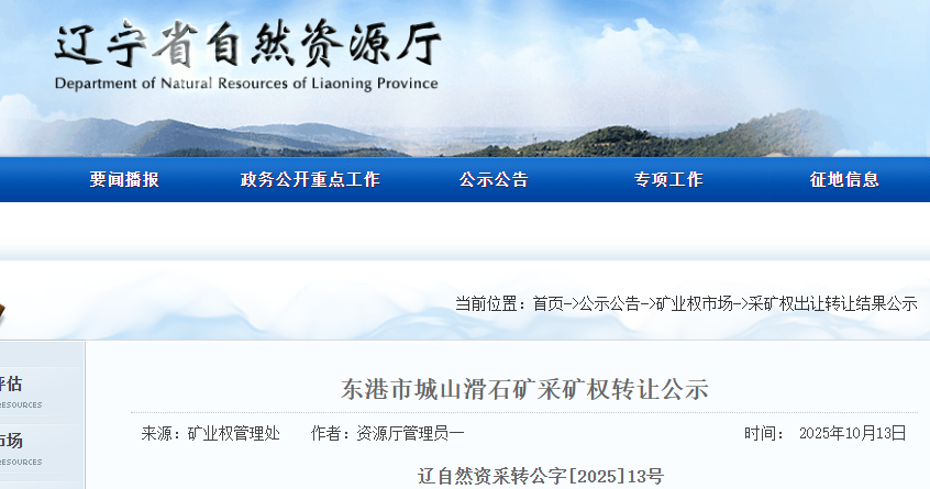 根據(jù)《探礦權(quán)采礦權(quán)轉(zhuǎn)讓管理辦法》(國(guó)務(wù)院令242號(hào))、《自然資源部關(guān)于印發(fā)礦業(yè)權(quán)出讓交易規(guī)則的通知》(自然資規(guī)〔2023〕1號(hào))等相關(guān)規(guī)定,現(xiàn)將東港市城山滑石礦采礦權(quán)轉(zhuǎn)讓信息公示如下: