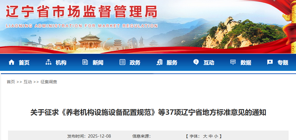 《養(yǎng)老機(jī)構(gòu)設(shè)施設(shè)備配置規(guī)范》等37項(xiàng)遼寧省地方標(biāo)準(zhǔn)已經(jīng)通過技術(shù)審查并形成報(bào)批稿,擬對(duì)外正式發(fā)布,現(xiàn)公開征求意見。請(qǐng)于2025年12月15日前,將意見反饋至遼寧省市場(chǎng)監(jiān)督管理局標(biāo)準(zhǔn)處。