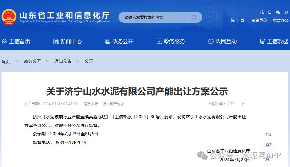 7月23日,山東省工業(yè)和信息化廳發(fā)布《關于濟寧山水水泥有限公司產能出讓方案公示》。