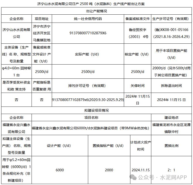 根據公示,福建省永定興鑫水泥有限公司擬在福建省龍巖市永定區(qū)龍?zhí)舵?zhèn)聯中村建設一條6000t/d水泥熟料建設項目(帶9MW余熱發(fā)電),置換比例2:1,計劃2024年11月15日點火投產。用于本項目置換產能為濟寧山水水泥有限公司2000t/d(另外500t/d用于其它項目置換產能)φ4.0×60m 回轉窯1臺,計劃2024年11月15日拆除退出。