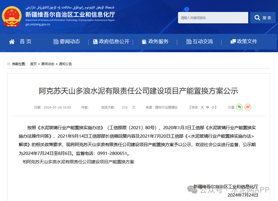 7月24日,新疆維吾爾自治區(qū)工業(yè)和信息化廳公示《阿克蘇天山多浪有限責(zé)任公司建設(shè)項(xiàng)目產(chǎn)能置換方案》。