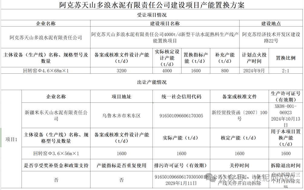 根據(jù)公示,阿克蘇天山多浪有限責(zé)任公司(天山股份旗下企業(yè))備案或核準(zhǔn)文件設(shè)計(jì)產(chǎn)能為3200t/d,實(shí)際核定產(chǎn)能為4000t/d,置換補(bǔ)充800t/d產(chǎn)能,置換比例2:1。