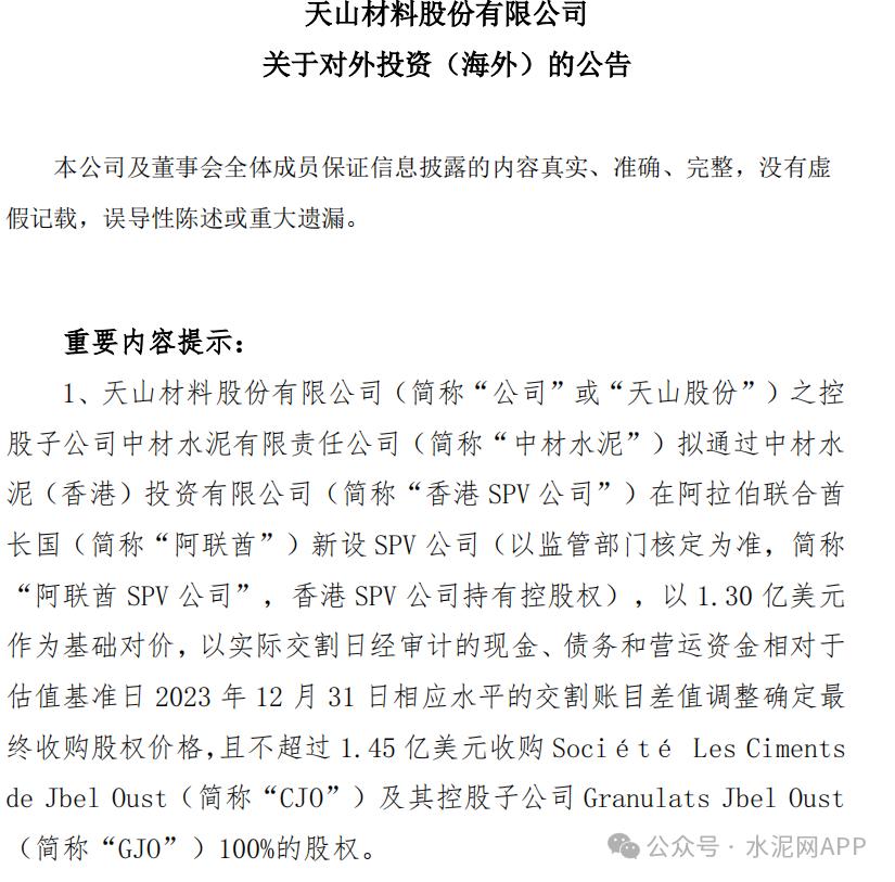 天山股份7月26日晚間公告,公司控股子公司中材水泥擬通過其全資子公司香港SPV公司在阿聯(lián)酋新設(shè)阿聯(lián)酋SPV公司,并引入其他投資人,以阿聯(lián)酋SPV公司為主體收購?fù)荒崴笴JO及其所屬GJO公司100%的股權(quán)。