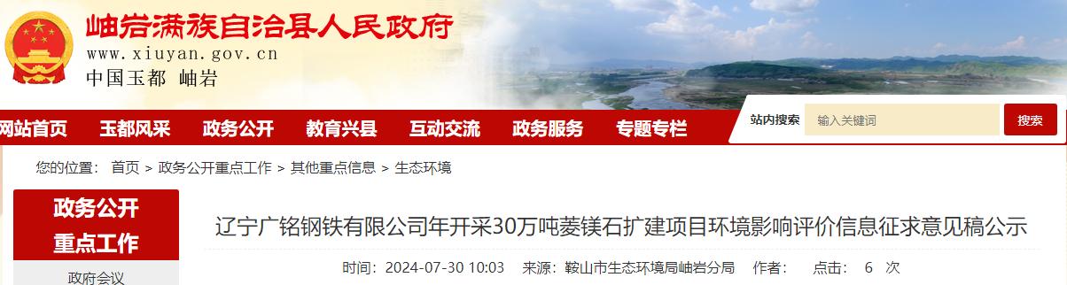 遼寧廣銘鋼鐵有限公司年開(kāi)采30萬(wàn)噸菱鎂石擴(kuò)建項(xiàng)目已委托沈陽(yáng)東環(huán)環(huán)境咨詢有限公司開(kāi)展環(huán)境影響評(píng)價(jià)工作,現(xiàn)按照《環(huán)境影響評(píng)價(jià)公眾參與辦法》(生態(tài)環(huán)境部令 第4號(hào))等法律法規(guī)文件要求,對(duì)該項(xiàng)目建設(shè)基本情況及公眾參與形式等信息公告如下,望廣大公眾積極參與,對(duì)項(xiàng)目的建設(shè)提出寶貴意見(jiàn)。
