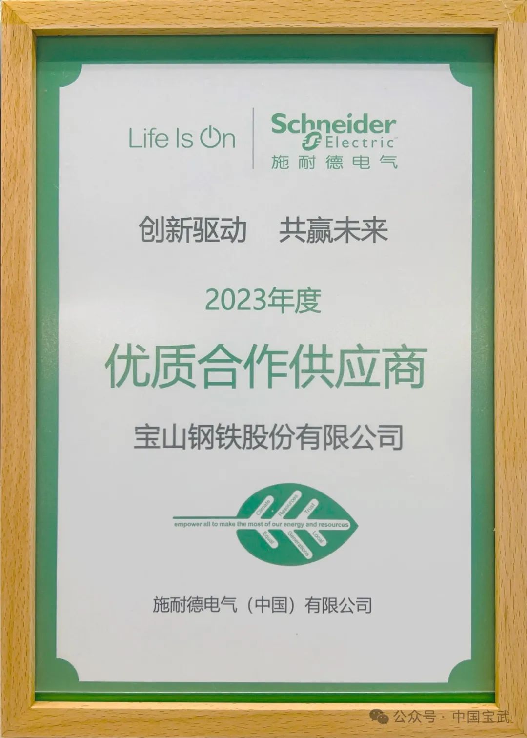 施耐德電氣作為全球領(lǐng)先的能源管理和自動化解決方案提供商,一直以來都對供應(yīng)商的選擇有著嚴格的標準和要求。寶鋼股份憑借卓越的產(chǎn)品質(zhì)量、高效的供應(yīng)鏈管理和持續(xù)的技術(shù)創(chuàng)新,成功獲得了施耐德電氣的青睞,成為其重要的合作伙伴之一。在施耐德電氣(中國)2024年創(chuàng)新峰會及中國供應(yīng)商大會上,寶鋼股份榮獲了“2023年度優(yōu)質(zhì)合作供應(yīng)商”的殊榮。