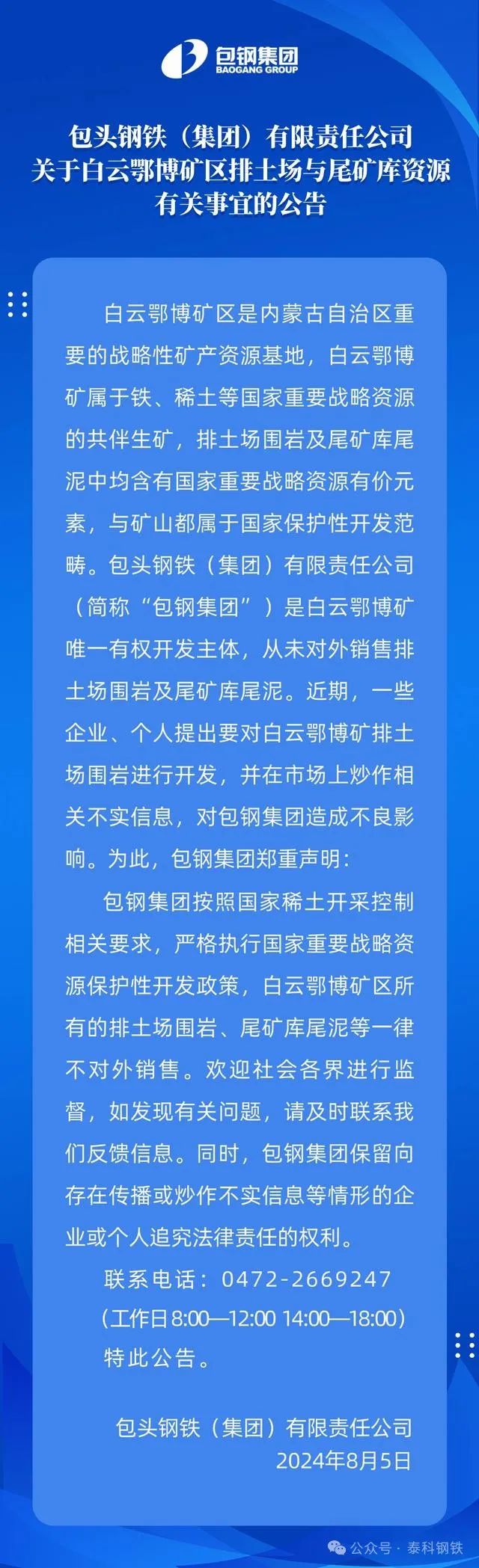 8月5日,包鋼集團(tuán)發(fā)布關(guān)于白云鄂博礦區(qū)排土場(chǎng)與尾礦庫(kù)資源有關(guān)事宜的公告。公告指出,近期,一些企業(yè)、個(gè)人提出要對(duì)白云鄂博礦排土場(chǎng)圍巖進(jìn)行開(kāi)發(fā),并在市場(chǎng)上炒作相關(guān)不實(shí)信息,對(duì)包鋼集團(tuán)造成不良影響。包鋼集團(tuán)按照國(guó)家稀土開(kāi)采控制相關(guān)要求,嚴(yán)格執(zhí)行國(guó)家重要戰(zhàn)略資源保護(hù)性開(kāi)發(fā)政策,白云鄂博礦區(qū)所有的排土場(chǎng)圍巖、尾礦庫(kù)尾泥等一律不對(duì)外銷售。