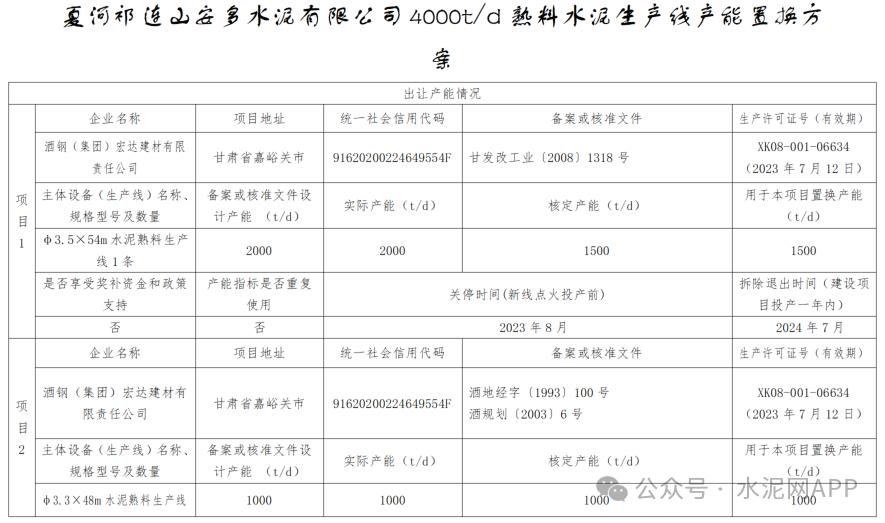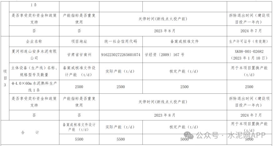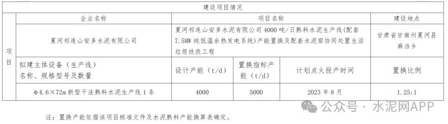 據(jù)甘肅工信廳此前發(fā)布,夏河祁連山安多水泥原計劃在夏河縣麻當鄉(xiāng)置換新建一條4000t/d熟料項目,置換比例1.25:1,產(chǎn)能置換方案如下: