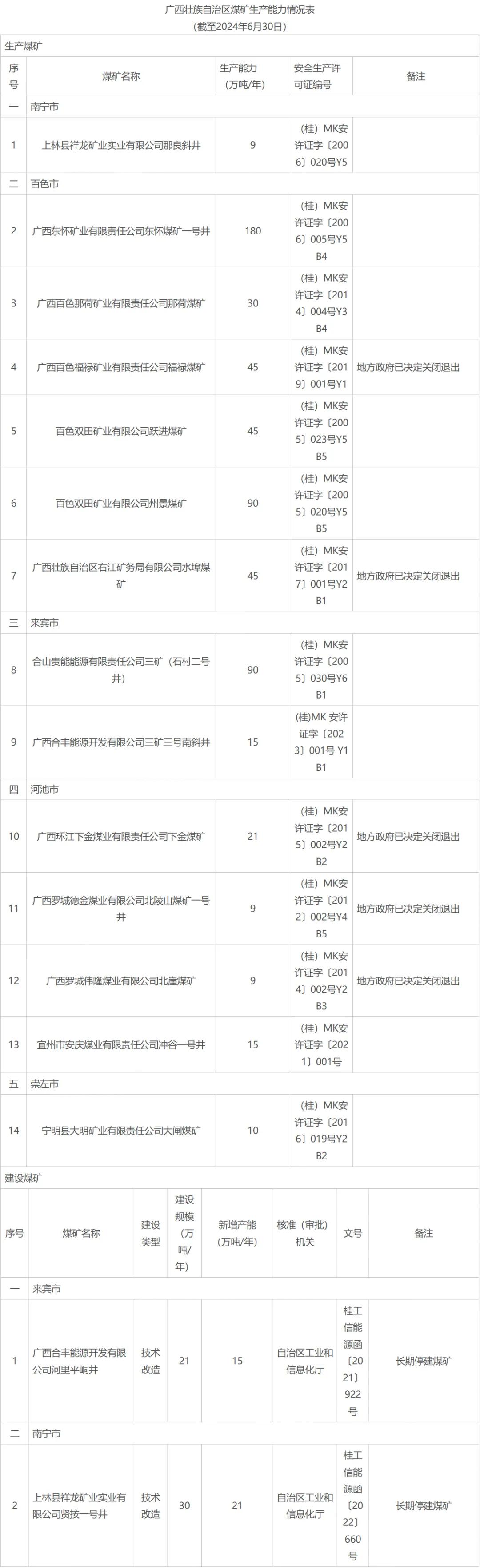 2.廣西百礦紅嶺礦業(yè)有限責(zé)任公司紅嶺煤礦(45萬(wàn)噸/年)屬新建煤礦,因核準(zhǔn)已過(guò)期且未開(kāi)工建設(shè),暫不公告。