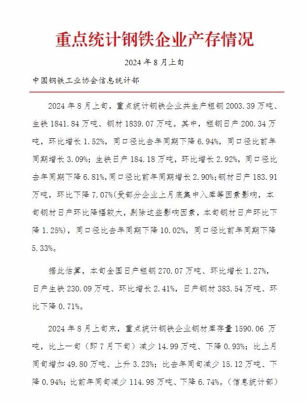 據(jù)中鋼協(xié)數(shù)據(jù)顯示,2024年8月上旬,重點(diǎn)統(tǒng)計(jì)鋼鐵企業(yè)粗鋼日產(chǎn)200.34萬(wàn)噸,環(huán)比增長(zhǎng)1.52%,同口徑比去年同期下降6.94%。8月上旬末,鋼材庫(kù)存量1590.06萬(wàn)噸,比上一旬下降0.93%,比上月同旬上升3.23%。