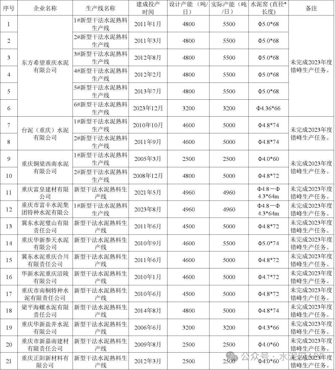 根據(jù)公示清單,截至2023年12月31日,重慶市共計47條水泥熟料生產(chǎn)線,其中:14家企業(yè)21條生產(chǎn)線未完成2023年度錯峰生產(chǎn)任務(wù);8條生產(chǎn)線已公告將搬遷。未完成2023年度錯峰生產(chǎn)任務(wù)清單