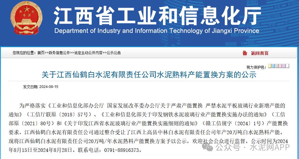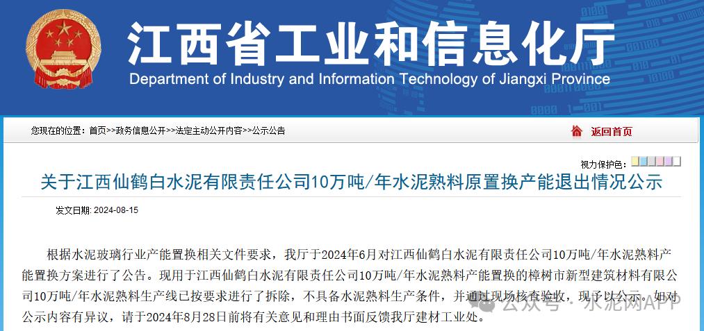 8月15日,江西省工信廳發(fā)布關(guān)于江西仙鶴白水泥有限責(zé)任公司水泥熟料產(chǎn)能置換方案的公示。