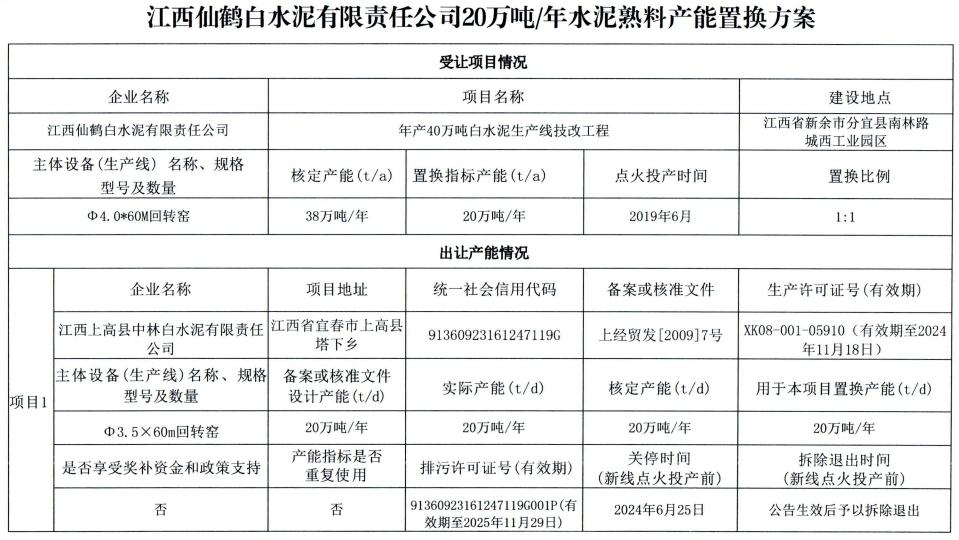 方案顯示,江西仙鶴白水泥有限責(zé)任公司通過整合受讓了江西上高縣中林白水泥有限責(zé)任公司年產(chǎn)20萬噸白水泥熟料產(chǎn)能,進(jìn)行年產(chǎn)40萬噸白水泥生產(chǎn)線技改工程,置換比例1∶1。該項(xiàng)目已于2019年6月點(diǎn)火投產(chǎn)。
