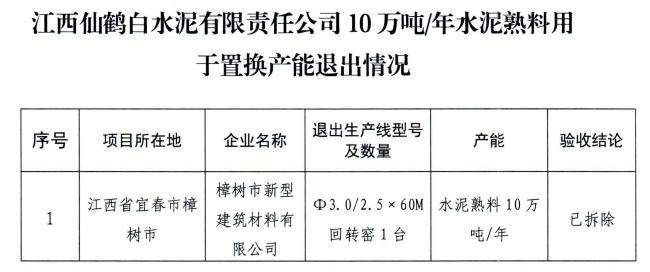 與此同時(shí)。江西工信廳另一則公示顯示,現(xiàn)用于江西仙鶴白水泥有限責(zé)任公司10萬噸/年水泥熟料產(chǎn)能置換的樟樹市新型建筑材料有限公司10萬噸/年水泥熟料生產(chǎn)線已按要求進(jìn)行了拆除,不具備水泥熟料生產(chǎn)條件,并通過現(xiàn)場核查驗(yàn)收。