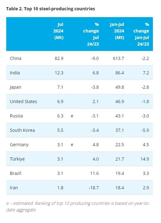 世界鋼鐵協(xié)會(huì)數(shù)據(jù)顯示,2024年7月全球71個(gè)納入世界鋼鐵協(xié)會(huì)統(tǒng)計(jì)國(guó)家的粗鋼產(chǎn)量為1.528億噸,同比下降4.7%。其中,中國(guó)粗鋼產(chǎn)量同比下降9.0%,降至8290萬噸。印度7月粗鋼產(chǎn)量為1230萬噸,同比增加6.8%;今年1-7月粗鋼產(chǎn)量為0.864億噸,同比增加7.2%。