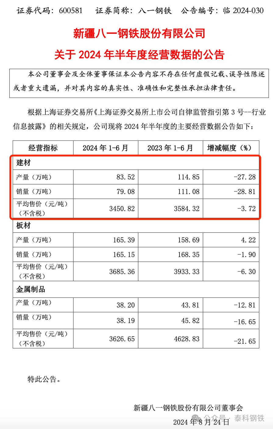 八一鋼鐵2023年實(shí)現(xiàn)營(yíng)業(yè)收入229.71億元,同比下降0.32%,實(shí)現(xiàn)歸母凈利潤(rùn)-11.63億元,虧損同比減少14.59%。報(bào)告稱,2024年上半年,公司仍堅(jiān)持穩(wěn)中求進(jìn)工作總基調(diào),加強(qiáng)對(duì)全國(guó)和新疆鋼鐵行業(yè)形勢(shì)研判,當(dāng)前鋼鐵行業(yè)競(jìng)爭(zhēng)激烈,正從增量發(fā)展階段向存量?jī)?yōu)化階段轉(zhuǎn)變,充足的產(chǎn)能與需求強(qiáng)度減弱之間的矛盾將更加突出,現(xiàn)處在減量調(diào)結(jié)構(gòu)周期,公司不斷加強(qiáng)上下游協(xié)作,保障產(chǎn)業(yè)鏈平穩(wěn)運(yùn)行。 公司持續(xù)優(yōu)化內(nèi)部管理和運(yùn)營(yíng)機(jī)制,不斷提高生產(chǎn)效率和經(jīng)濟(jì)效益,推行精細(xì)化管理,加強(qiáng) 算賬經(jīng)營(yíng),增強(qiáng)產(chǎn)品核心競(jìng)爭(zhēng)力,積極應(yīng)對(duì)市場(chǎng)風(fēng)險(xiǎn)和挑戰(zhàn),推進(jìn)公司高質(zhì)量發(fā)展。 報(bào)告期公司實(shí)現(xiàn)鐵產(chǎn)量 234萬(wàn)噸、鋼產(chǎn)量267萬(wàn)噸、商品材產(chǎn)量 249 萬(wàn)噸,同比分別減少 30萬(wàn)噸、21萬(wàn)噸、25萬(wàn)噸。實(shí)現(xiàn)營(yíng)業(yè)收入 93.63 億元,同比降幅 16.28%,營(yíng)業(yè)成本 95.63億元,同比降幅15.38%,累積虧損7.2 億元,同比減虧0.5億。