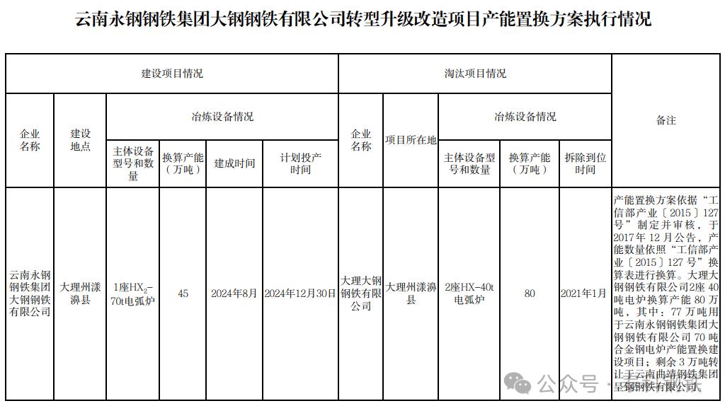 2024年8月27日、8月22日,大理白族自治州人民政府、祿豐市人民政府分別發(fā)布公示,云南永鋼鋼鐵集團(tuán)大鋼鋼鐵有限公司1×70t合金鋼電弧爐現(xiàn)已建成;云南德勝鋼鐵有限公司轉(zhuǎn)型升級(jí)改造項(xiàng)目產(chǎn)能置換方案中的1座450立方米高爐(1#)已拆除,1座1580立方米高爐(1#)已建成。